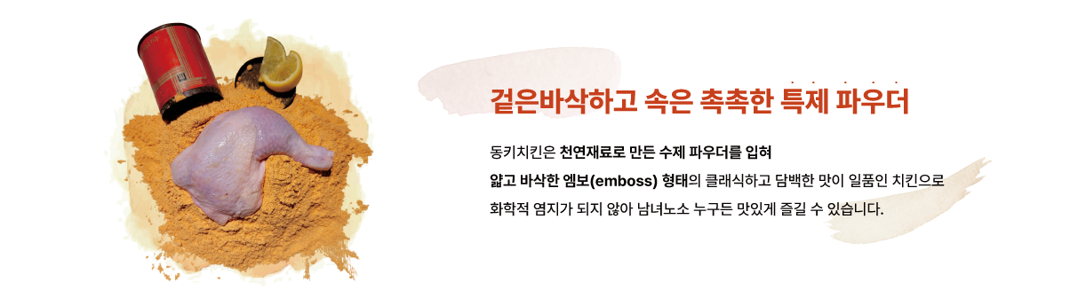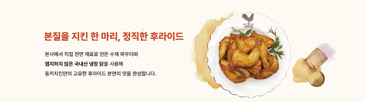 동키치킨은 원재료에서부터 다릅니다. 국내산 닭만을 사용하고, 무염지 공정을 적용해 재료 본연의 맛을 살렸습니다. 여기에 자체 개발한 수제 파우더를 더해 자극적이지 않으면서도 계속 생각나는 깊은 맛의 치킨을 완성했습니다. 유행에 따라 바뀌는 맛이 아닌, 오랜 시간 검증된 기준으로 타 브랜드와 확실히 차별화된 치킨을 제공합니다.